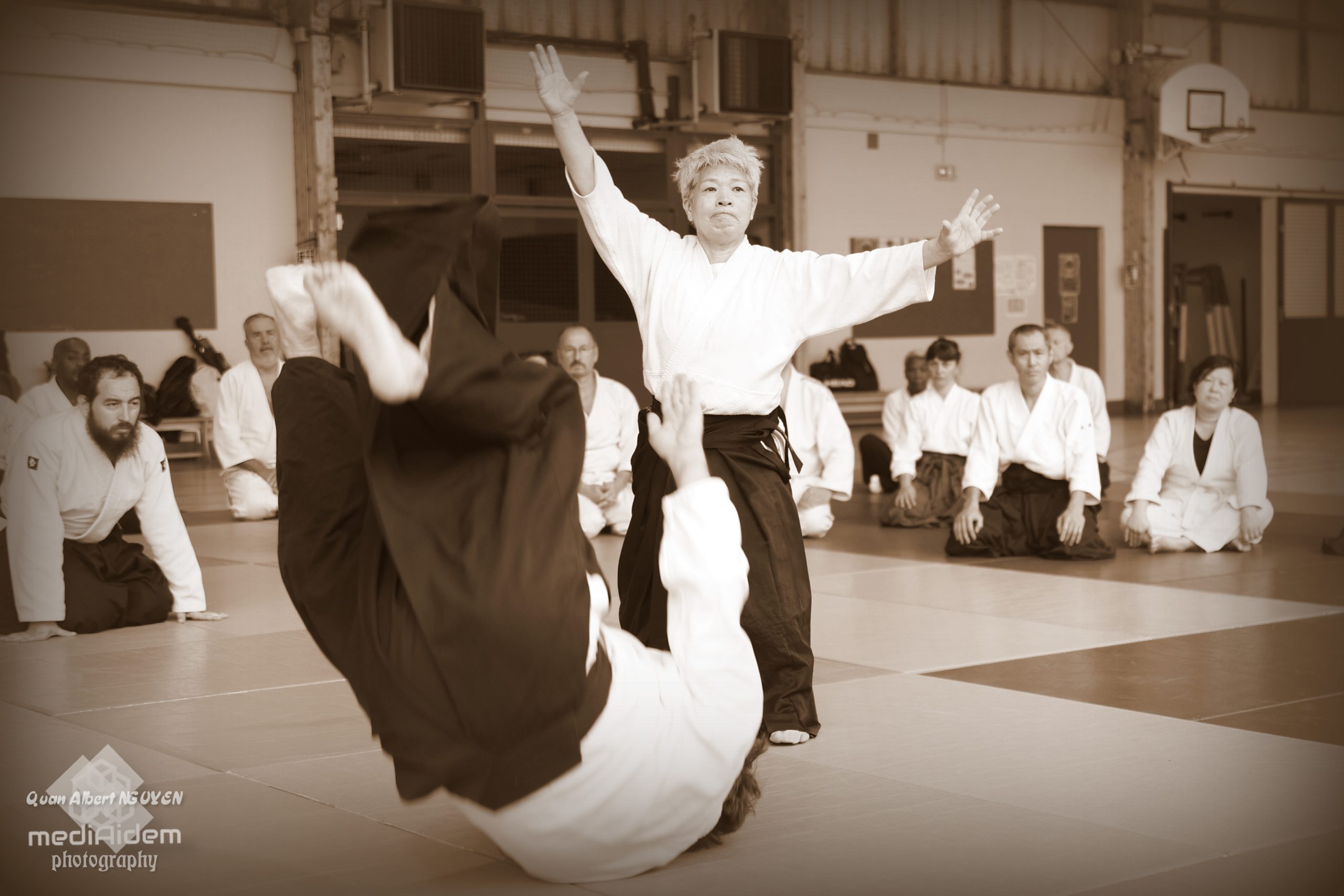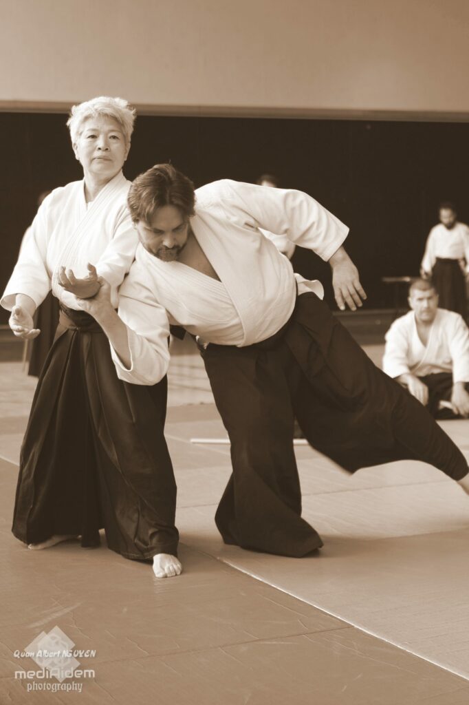 Mikiko Sugawara : Non, je dirais que sur ce point mon enseignement reste le même. En revanche, je peux faire une différence par rapport à l’âge. Effectivement, si une personne un peu plus âgée débute l’aïkido – car on peut commencer l’aïkido à tout âge – j’expliquerai peut-être d’une façon un peu plus lente, plus soignée, avec plus de détails. Alors qu’avec un jeune ça sera peut-être complètement différent. J’ai envie de dire que l’adaptation de l’enseignement se fera plutôt en fonction de l’âge que du genre. Par exemple, pour que les enfants comprennent, il faut des instructions simplifiées et directes, alors qu’avec les personnes âgées, qui sont nombreuses en France et au Japon, je ferais plus attention à ce qu’elles évitent les blessures.